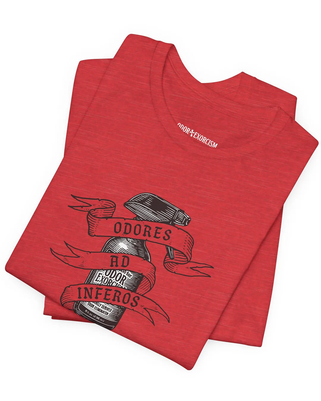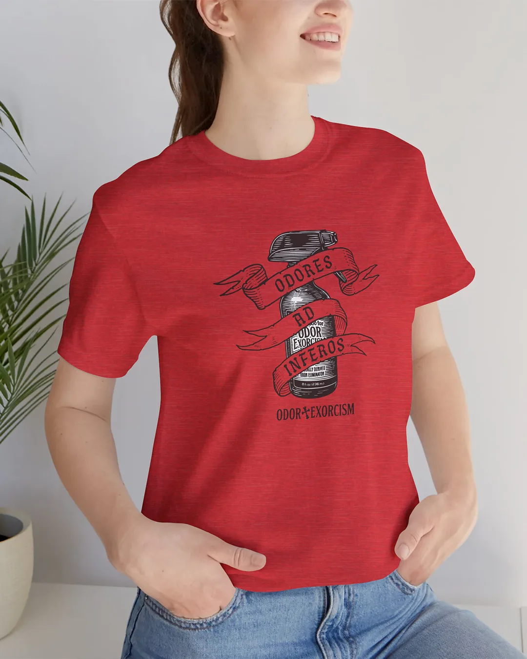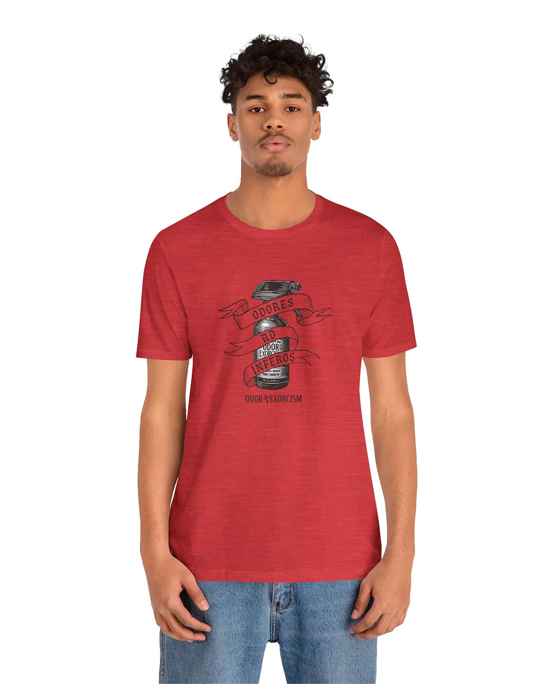 Throw on this Bella+Canvas 3001 Heather Red Odor Exorcism t-shirt and see how fast the evil aromas in your home board a one-way train to hell.