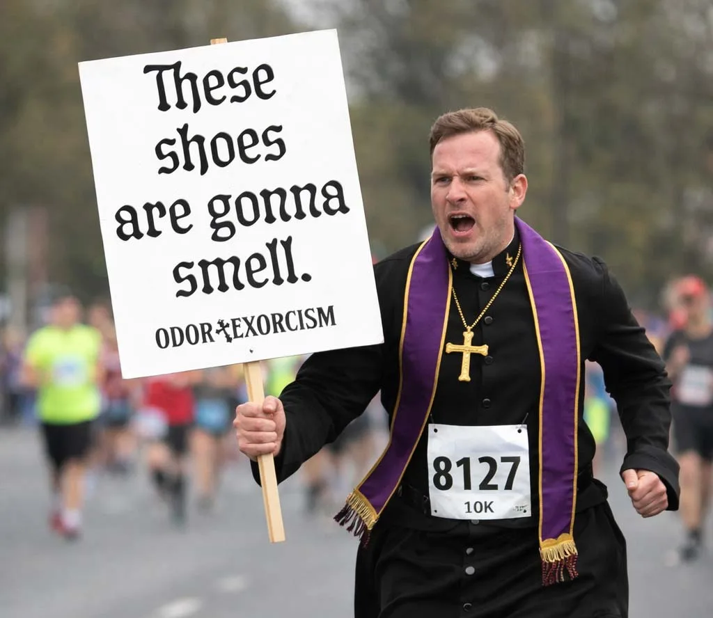 Expect to see Odor Exorcism posting QR codes at your favorite local third spaces, making funny social media videos, and even running the Cap10K in full exorcist regalia: